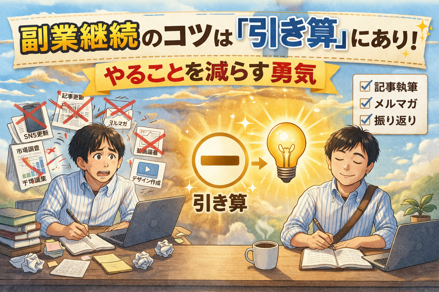 副業を頑張ろうとすると、つい「足し算」で考えてしまいがちです。しかし、本当に大切なのは「これだけは守る」という最小単位を見つける「引き算」の思考です。シンプルイズベスト。これが継続の黄金律です。